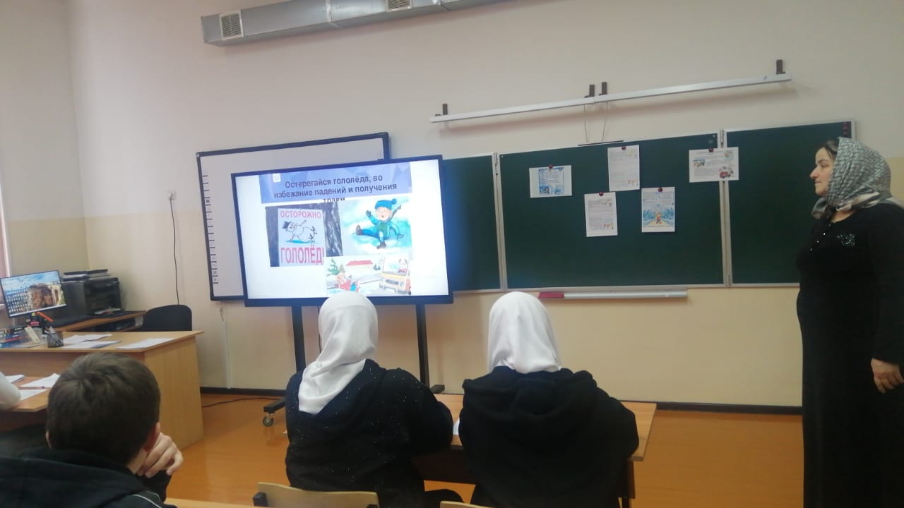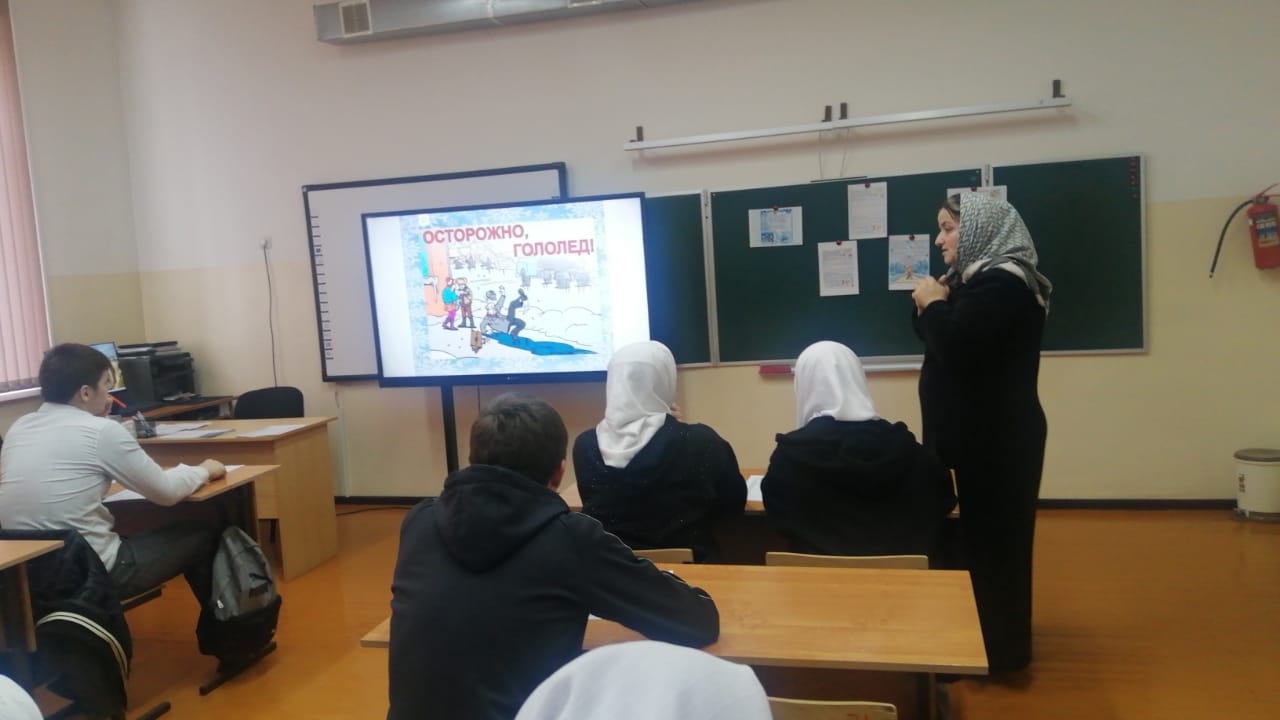 В целях обеспечения безопасности пешеходов в зимний период была организована беседа «Осторожно, гололёд!». Руководитель отряда ЮИД Чучаева К. С. рассказала о правилах безопасного перехода проезжей части, а также безопасности дорожного движения, напомнила детям о том, что при снегопаде и метели возрастает вероятность заносов автомобилей на дороге, поэтому пешеходам необходимо быть более внимательными. Пересекать проезжую часть нужно исключительно по пешеходным переходам, не перебегать улицу, а переходить ее шагом, чтобы не поскользнуться и не получить травму, носить обувь с нескользящей поверхностью, передвигаться осторожно и не торопясь. Разобрали понятия «Гололед» и «Гололедица». По статистике, около 40% всех ДТП в зимнее время вызвано гололедом и снегопадом. С наступлением холодов растет количество уличных травм: ушибы, вывихи и переломы. И чтобы уменьшить вероятность падения, необходимо соблюдать правила поведения при гололеде.