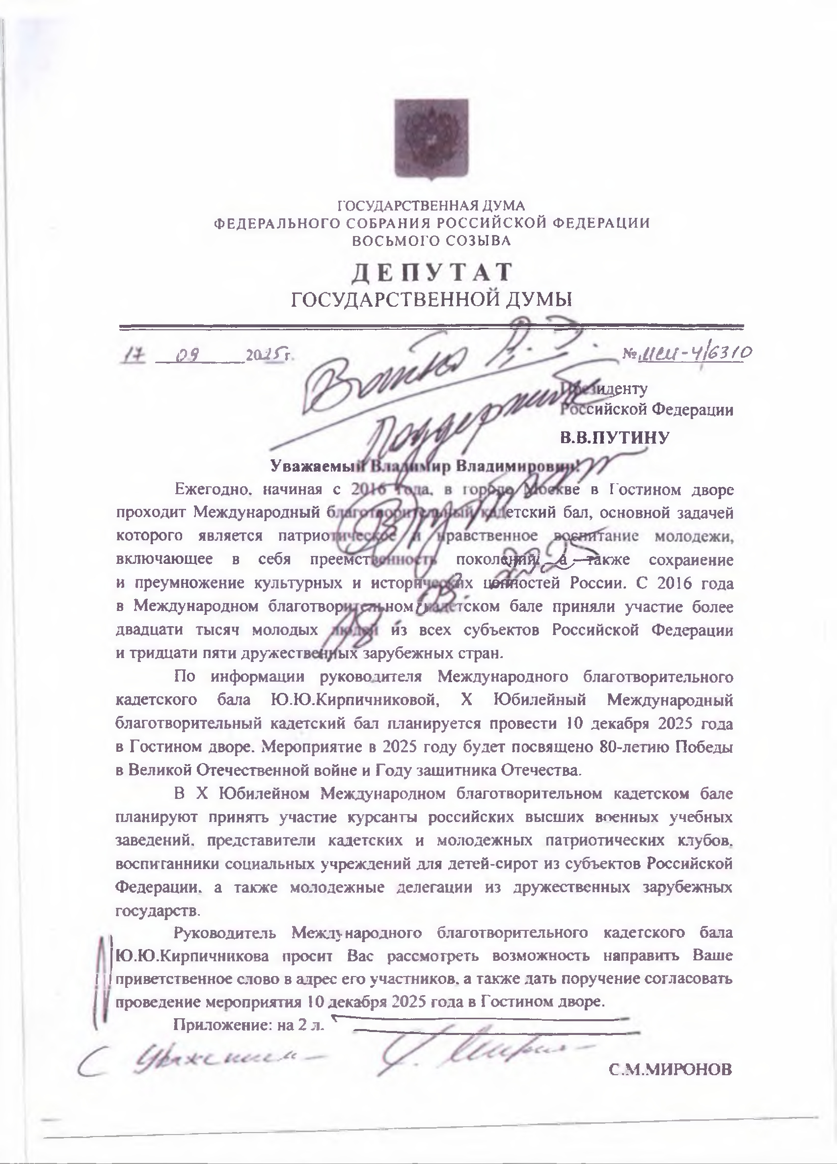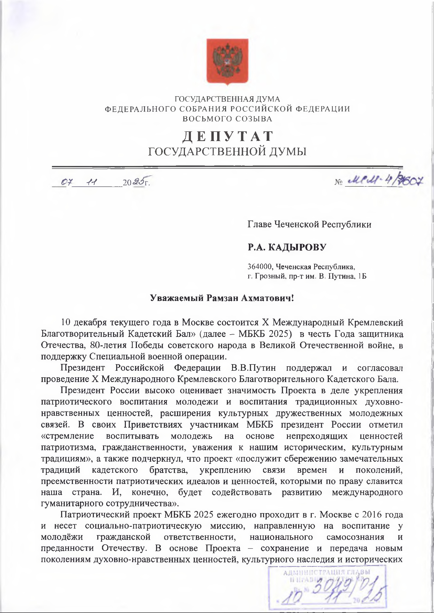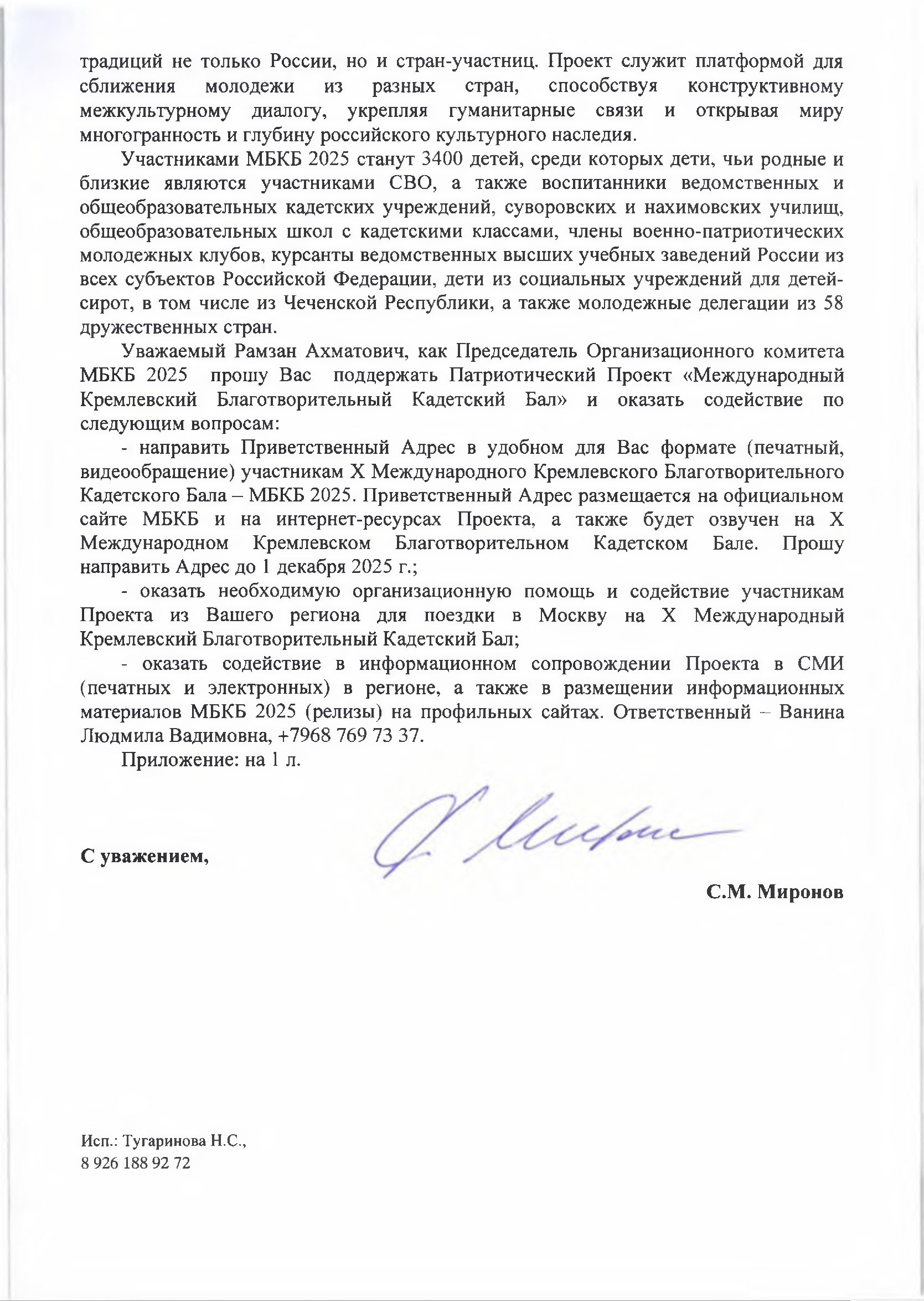 Депутат государственной Думы РФ Миронов С.М.,обратился к главе Чеченской Республики Кадырову Р.А.
